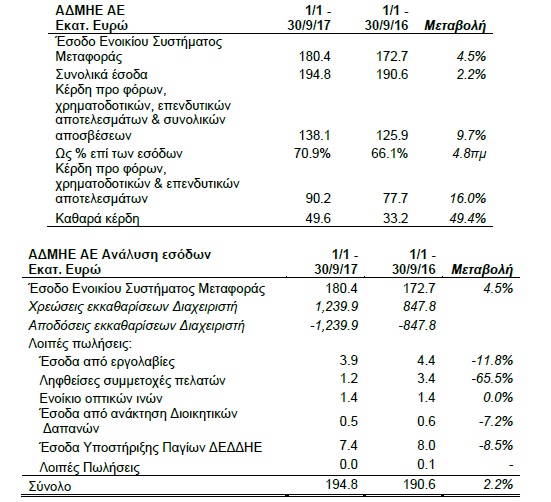 Ανοδικά κινήθηκαν τα βασικά μεγέθη του Ανεξάρτητου Διαχειριστή Συστήματος Ηλεκτρικής Ενέργειας (ΑΔΜΗΕ) στο 9μηνο, με σημαντική άνοδο στα καθαρά κέρδη κατά 49,4%, στα 49,6 εκ. ευρώ έναντι 33,2 εκ. την περσινή αντίστοιχη περίοδο. Στο ίδιο μοτίβο και τα EBITDA με άνοδο στα 138 εκατ ευρώ έναντι 152,9 εκ. ευρώ προηγουμένως. Σύμφωνα με τις εκτιμήσεις της διοίκησης, η πορεία των δραστηριοτήτων και τα χρηματοοικονομικά αποτελέσματα βαίνουν βάσει των εκτιμήσεων, διατηρώντας τις προηγούμενες προβλέψεις.