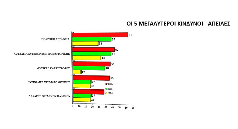 Σε σύγκριση με προηγούμενες έρευνες η μεσοσταθμική αύξηση κινδύνων φτάνει το εντυπωσιακό 60%, με την πολιτική αστάθεια να εδραιώνεται ως ο σημαντικότερος κίνδυνος με πολύ αυξημένα ποσοστά, ενώ δυσκολίες χρηματοδότησης και αλλαγές θεσμικού πλαισίου εμφανίζουν διπλάσια σχεδόν ποσοστά σε σχέση με το 2015 και σταθερά υψηλά είναι τα ποσοστά για ασφάλεια συστημάτων και φυσικές καταστροφές.