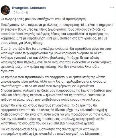 Στο τέλος της ανάρτησης του ο κ. Αντώναρος αναφέρει ότι «για να εξασφαλισθεί δε η μυστικότητα της σύνταξης των καταλόγων υποψηφίων η ευθύνη έχει ανατεθεί σε στενό συγγενή του Μητσοτάκη».