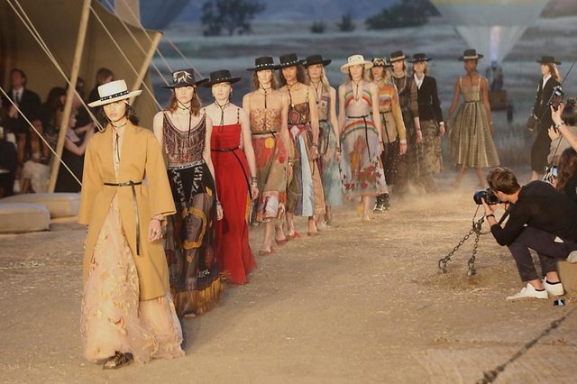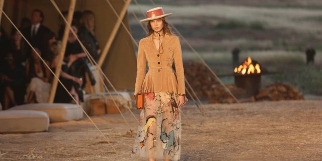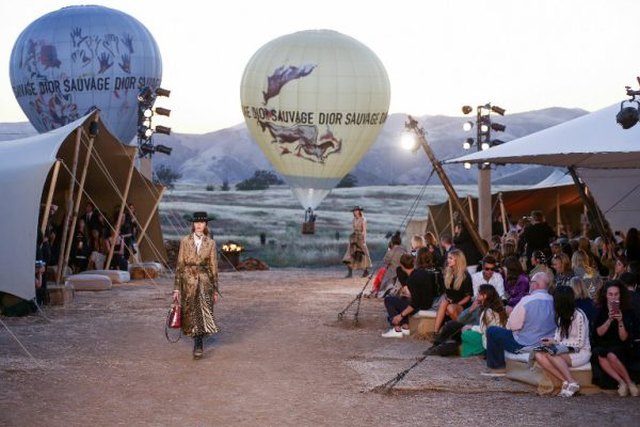 Εσάρπες, φούστες πλισέ, καπέλα bolero, εμπριμέ παντελόνες, μπότες με κορδόνια. Η παρουσίαση της κολεξιόν "Dior Sauvage" έγινε το ηλιοβασίλεμα, μέσα στις κοιλάδες του εθνικού δρυμού Upper Las Virgences Canyon Open Space, όπου οι καλεσμένοι μεταφέρθηκαν με πούλμαν από το Μπέβερλι Χιλς και τη Σάντα Μόνικα, μια διαδρομή περίπου 45 λεπτών.