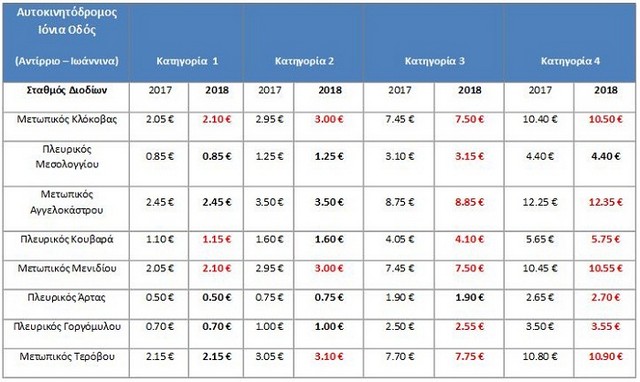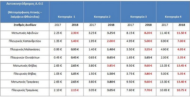 Αναλυτικά και ανά αυτοκινητόδρομο/σταθμό διοδίων, οι νέες τιμές είναι οι εξής (με κόκκινο εμφανίζονται οι αυξημένες τιμές):