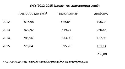 Στον παρακάτω πίνακα φαίνονται στην πρώτη στήλη οι δαπάνες που κατέβαλε κάθε χρόνο η ΔΕΗ για ΥΚΩ, στη δεύτερη στήλη τα ποσά που τιμολογήθηκαν, βάσει του νόμου του 2012, και στην τρίτη η διαφορά, δηλαδή  η ετήσια υποανάκτηση από τη ΔΕΗ. Είναι προφανές ότι η υποανάκτηση αυτή είναι πρακτικά σημαντικά μεγαλύτερη καθώς τα ποσά που εισπράττει η ΔΕΗ είναι λιγότερα από αυτά που τιμολογούνται.