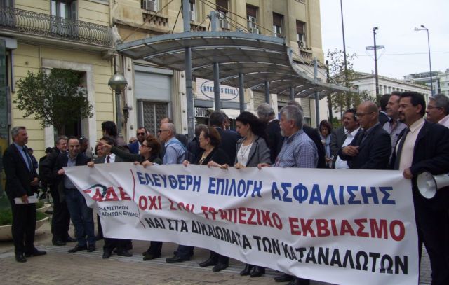 Διαμαρτυρίες σε 20 πόλεις της Ελλάδας πραγματοποίησαν σήμερα οι εκπρόσωποι του κλάδου της ασφαλιστικής διαμεσολάβησης καταγγέλλοντας τις αθέμιτες πρακτικές των τραπεζικών ιδρυμάτων αλλά ταυτόχρονα και ενημερώνοντας τους καταναλωτές για τα δικαιώματα τους. Στην Αθήνα οι διαμαρτυρίες πραγματοποιήθηκα στην οδό Κοραή.