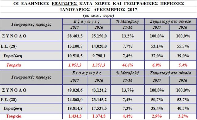 Ειδικότερα, σύμφωνα με την ΕΛΣΤΑΤ, η αξία των ελληνικών εξαγωγών του 2016, ανήλθε σε 1.351,3 εκατ. ευρώ και οι εισαγωγές από την Τουρκία ανήλθαν σε 1.374,5 εκατ. ευρώ, με το ισοζύγιο να είναι ελλειμματικό σε βάρος της Ελλάδας κατά 23,2 εκατ. ευρώ.