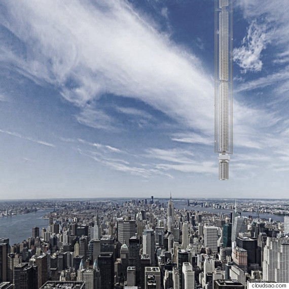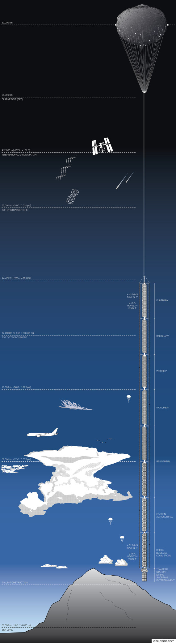 Όπως γράφουν στην ιστοσελίδα τους (Clouds Architecture Office), ένας μεγάλος αστεροειδής θα μπορούσε να μεταφερθεί σε τροχιά ειδικά για αυτή τη δουλειά, και να ακολουθήσει η κάθοδος ενός εξαιρετικά μεγάλης αντοχής καλωδίου, από το οποίο θα κρεμόταν ο ουρανοξύστης, ώστε να αιωρείται στον αέρα της Γης!