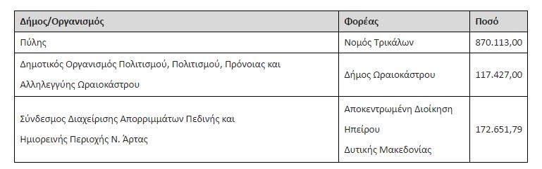 Τέλος, εγκρίθηκαν οι παρακάτω επιχορηγήσεις ύψους 1.160.191,79 ευρώ σε Οργανισμούς Τοπικής Αυτοδιοίκησης Α’ και Β’ βαθμού και στις δομές τους, αποκλειστικά για την εξόφληση ληξιπρόθεσμων υποχρεώσεων αυτών των οργανισμών προς τρίτους, με χρέωση του λογαριασμού του Υπουργείου Εσωτερικών «Επιχορηγήσεις εποπτευόμενων φορέων του ΥΠΕΣ – κάλυψη ληξιπρόθεσμων υποχρεώσεων», που τηρείται στο Ταμείο Παρακαταθηκών και Δανείων για αυτούς τους λόγους.