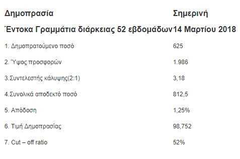 Το επιτόκιο διαμορφώθηκε σε 1,25%, καθώς η ζήτηση ήταν ιδιαίτερα έντονη. Ο συντελεστής κάλυψης ήταν στο 3,18.