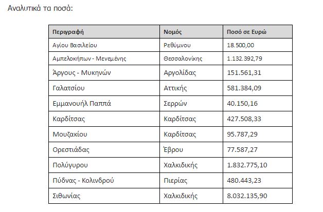 Ο Υπουργός Εσωτερικών, Πάνος Σκουρλέτης, ενέκρινε την επιχορήγηση συνολικού ποσού 12.870.225,47 ευρώ στους Δήμους της Χώρας που αναφέρονται στον ακόλουθο πίνακα, αποκλειστικά και μόνο για την εξόφληση υποχρεώσεών τους που προέρχονται από δικαστικές αποφάσεις και διαταγές πληρωμής που έχουν καταστεί τελεσίδικες έως 1/3/2017, από τα χρηματικά διαθέσιμα του προγράμματος Αυτοδιοίκηση Κοινωνική Συνοχή - Ισόρροπη Ανάπτυξη (ΑΚΣΙΑ).