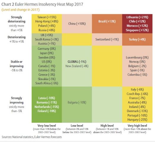 Μεγάλη επιδείνωση δεικτών αναμένεται να καταγραφεί μέσα στο 2017 σε Σιγκαπούρη, Λιθουανία, Χιλή, Μαρόκο, Βραζιλία, Κίνα, Ρωσία, Πολωνία, Χονγκ Κόνγκ, Ταϊβάν. Ελάχιστη βελτίωση θα σημειωθεί στην Ελλάδα, Γερμανία, Σουηδία, Καναδά, Εσθονία, Ιαπωνία, Νότια Αφρική, Σλοβακία, σύμφωνα με την Euler Hermes. Στον αντίποδα ισχυρή βελτίωση αναμένεται να υπάρξει σε Ιταλία, Τσεχία, Γαλλία, Αυστραλία, Ιρλανδία, Δανία, Πορτογαλία, Ουγγαρία