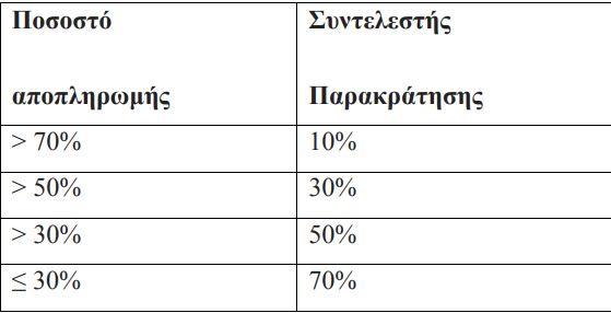 Ειδικότερα, τα ποσοστά παρακράτησης επί του εισπραττόμενου ποσού ξεκινούν από 10% όταν έχει καταβληθεί μέσω της ρύθμισης συνολικό ποσό μεγαλύτερο του 70% της ρυθμισμένης οφειλής, ανέρχονται σε 30%, όταν έχει καταβληθεί μέσω της ρύθμισης συνολικό ποσό μεγαλύτερο του 50% της ρυθμισμένης οφειλής, σε 50%, όταν έχει καταβληθεί συνολικό ποσό μεγαλύτερο του 30% της ρυθμισμένης οφειλής και φτάνουν το 70% όταν το αποπληρωμένο ποσό ρύθμισης είναι μικρότερο ή ίσο του 30%. Τα ως άνω κλιμακωτά ποσοστά μπορούν να αυξηθούν, υπό προϋποθέσεις, έως και 20 ποσοστιαίες μονάδες, κατόπιν ειδικής αιτιολογίας.