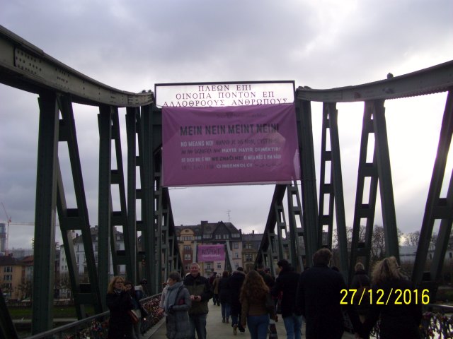Ακριβώς απέναντι από το μουσείο, στο αρχή της πεζογέφυρας Eiserner steg που ενώνει το ιστορικό κέντρο της Φρανκφούρτης με το Sachesnhausen, ο στίχος από την Ιλιάδα του Ομήρο «ΠΛΕΩΝ ΕΠΙ ΟΙΝΟΠΑ ΠΟΝΤΟΝ ΕΠ ΑΛΛΟΘΡΟΟΥΣ ΑΝΘΡΩΠΟΥΣ». Ο οίνωψ πόντος σημαίνει στα νέα ελληνικά, η θάλασσα με σκούρο κρασάτο χρώμα. Θροϊζω σημαίνει προκαλώ διαφορετικούς θορύβους, μιλάω διαφορετική γλώσσα. Οι αλλόθροοι άνθρωποι ήταν αυτοί, οι άνθρωποι που μιλούσαν διαφορετικές γλώσσες. Ο στίχος, ταιριαστός με τους κατοίκους της Φρανκφούρτης, ίσως και πάνω από το 50% του πληθυσμού ομιλούν διαφορετική γλώσσα, βρίσκονται όμως σε ένα κοινό τόπο με πάμπολλες εμπορικές δραστηριότητες.