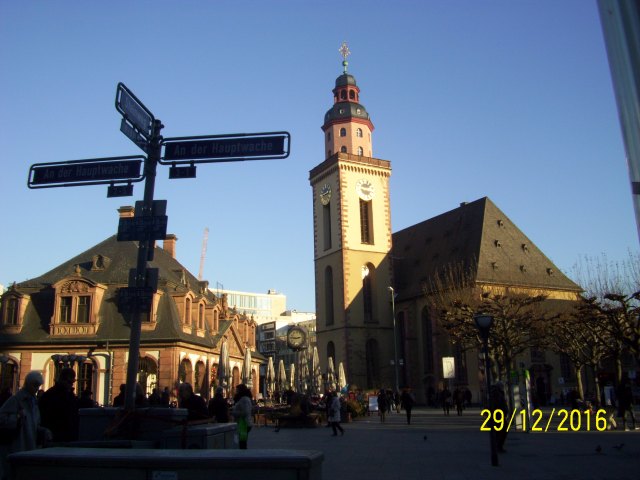 Δέκα λεπτά με τα πόδια από την Opernplatz και δύο μόλις στάσεις από τον Κεντρικό Σιδηροδρομικό Σταθμός της Φρανκφούρτης (Ηbf)βρίσκεται η Hauptwache. Είναι η πλατεία που συνδέεται με το εμπορικό κέντρο και το υπόγειο μετρό αφού από τους υπόγειους σταθμούς της σταματούν 13 γραμμές σταθερής τροχιάς ( S-Bahn και U-Bahn). Tο κτίριο της Hauptwache χτίστηκε το 1730 και ήταν οι φυλακές της πόλης.