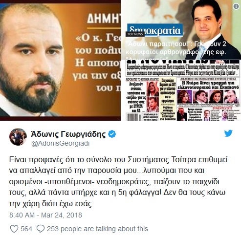 "Είναι προφανές ότι το σύνολο του Συστήματος Τσίπρα επιθυμεί να απαλλαγεί από την παρουσία μου...λυπούμαι που και ορισμένοι -υποτιθέμενοι- νεοδημοκράτες, παίζουν το παιχνίδι τους, αλλά πάντα υπήρχε και η 5η φάλαγγα! Δεν θα τους κάνω την χάρη διότι έχω εσάς", έγραψε στο Twitter o Άδωνις Γεωργιάδης.