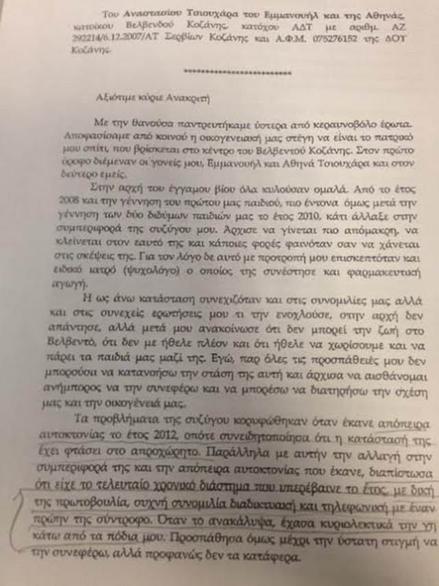 Όπως γράφει ο Ελεύθερος Τύπος, ο συζυγοκτόνος ισχυρίζεται στην απολογία του πως από το 2008, με τη γέννηση του πρώτου παιδιού τους και πιο έντονα μετά τη γέννηση των διδύμων το 2010, άλλαξε η συμπεριφορά της συζύγου του. «Αρχισε να γίνεται πιο απόμακρη, να κλείνεται στον εαυτό της και κάποιες φορές φαινόταν σαν να χάνεται στις σκέψεις της. Για το λόγο δε, αυτό με προτροπή μου επισκεπτόταν και ειδικό γιατρό (ψυχολόγο), ο οποίος της συνέστησε φαρμακευτική αγωγή. Η ως άνω κατάσταση συνεχιζόταν και στις συνομιλίες μας αλλά και στις συνεχείς ερωτήσεις μου τι την ενοχλούσε, στην αρχή δεν απάντησε, αλλά μετά μου ανακοίνωσε ότι δεν μπορεί τη ζωή στο Βελβεντό, ότι δεν με ήθελε πλέον και ότι ήθελε να χωρίσουμε και να πάρει τα παιδιά μας μαζί της. Εγώ, παρ’ όλες τις προσπάθειές μου, δεν μπορούσα να κατανοήσω τη στάση της αυτή και άρχισα να αισθάνομαι ανήμπορος να τη συνεφέρω και να μπορέσω να διατηρήσω τη σχέση μας και την οικογένειά μας» ανέφερε στην απολογία του.
