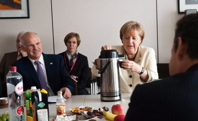 Οπότε είναι ένα τέχνασμα για να εντυπωσιάσει τους δημοσιογράφους; Ούτε. Αμερικανοί επικεφαλής επιχειρήσεων που επισκέφθηκαν την καγκελαρία εκθειάζουν το γεγονός ότι η καγκελάριος πιάνει το θερμός η ίδια. Και όχι μόνο στην καγκελαρία. Φωτογραφίες δείχνουν τη Μέρκελ να γεμίζει το 2011 στις Βρυξέλλες με καφέ το φλιτζάνι του τότε πρωθυπουργού της Ελλάδας, Γιώργου Παπανδρέου. Ή πως το 2015 σέρβιρε τον Αλέξη Τσίπρα από ασημί κανάτα. Σε μία φωτογραφία διακρίνεται ο Τσίπρας - με γεμάτο φλιτζάνι καφέ- εκείνος, όπως και η καγκελάριος, η οποία κρατά ακόμη την κανάτα - "λάμπουν"- "σαν να τον είχε απαλλάξει απ' όλα τα χρέη", σημειώνει το δημοσίευμα.