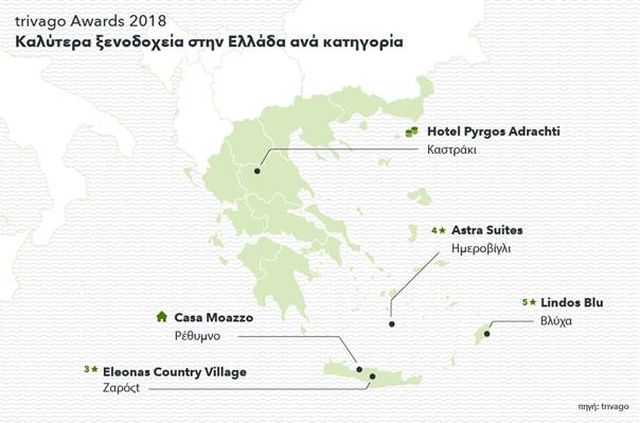 Αυτή τη χρονιά έχουμε στην αφρόκρεμα των ελληνικών καταλυμάτων τέσσερα ξενοδοχεία από τη νησιωτική Ελλάδα και ένα από την ηπειρωτική. Δύο ξενοδοχεία τα οποία αναδείχθηκαν κορυφαία στην κατηγορία τους προέρχονται από την Κρήτη, το Eleonas Country Village, το οποίο αναδείχθηκε για δεύτερη συνεχή χρονιά πρώτο στην κατηγορία 3 αστέρων και το Casa Moazzo, το οποίο αναδείχθηκε ως το καλύτερο εναλλακτικό κατάλυμα. Στην κατηγορία 5 αστέρων βραβεύθηκε επίσης για δεύτερη, συνεχή χρονιά το Lindos Blu από τη Ρόδο, ενώ στην κατηγορία 4 αστέρων ξεχώρισε το Astra Suites στο Ημεροβίγλι της Σαντορίνης. Τέλος οι ταξιδιώτες επέλεξαν ως καλύτερο κατάλυμα στην κατηγορία Best Value for Money το ξενοδοχείο Πύργος Αδράχτι στο Καστράκι, στην Καλαμπάκα.