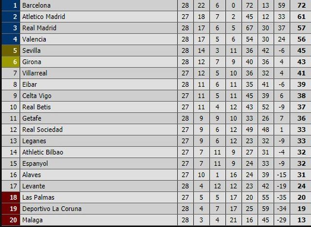 Με τη νίκη της αυτή Μπαρτσελόνα βρέθηκε στο +11 από τη δεύτερη Ατλέτικο Μαδρίτης, η οποία έχει ένα ματς λιγότερο αλλά και 15 βαθμούς μπροστά από τη Ρεάλ Μαδρίτης. Στον αντίποδα η Μάλαγα είναι τελευταία με 13 βαθμούς και δεν έχει πλέον ελπίδες σωτηρίας.