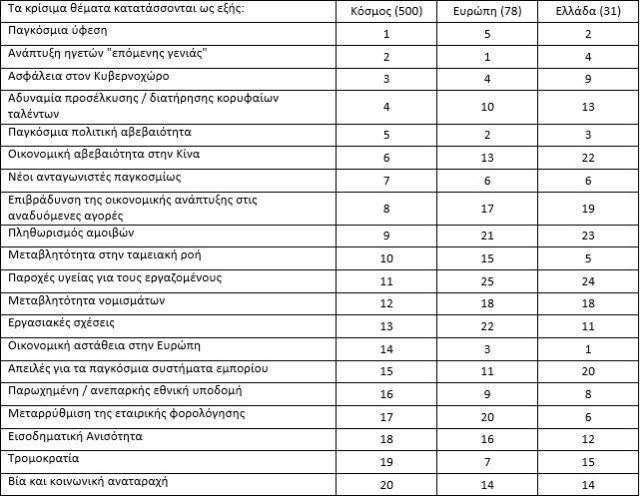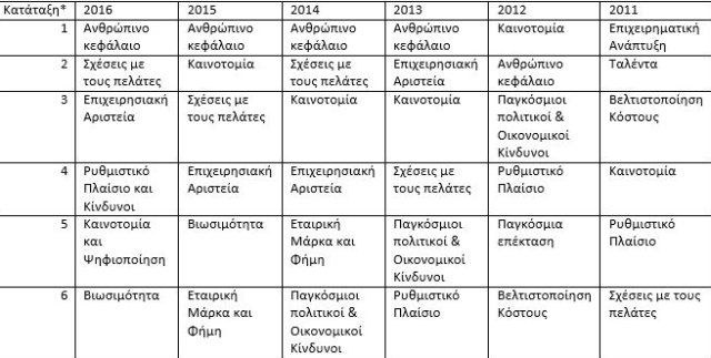 Για τους CEOs διεθνώς το Ανθρώπινο κεφάλαιο εξακολουθεί να είναι το πρώτο θέμα τα τελευταία τέσσερα χρόνια, ακολουθούμενο από τις Σχέσεις με τους πελάτες, την Επιχειρησιακή Αριστεία, το Ρυθμιστικό Πλαίσιο και τους Κινδύνους, την Καινοτομία και την Ψηφιοποίηση και τέλος τη Βιωσιμότητα.