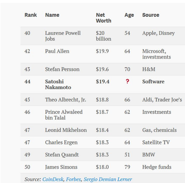 Κατορθώνοντας να πιάσει αυτή την τιμή, ο ανώνυμος δημιουργός του, γνωστός με το ψευδώνυμο Satoshi Nakamoto, αξίζει περί τα 19,4 δισ. δολάρια, καταλαμβάνει δηλαδή πλέον την 44η θέση των πλουσιότερων του κόσμου, σύμφωνα με τον κατάλογο Forbes. Ενδεικτικά να αναφέρουμε ότι ξεπερνά τον Πρίγκιπα Πρίγκιπας al-Waleed bin Talal, που κάποτε είχε αποκαλέσει το Bitcoin ένα οικονομικό σκάνδαλο παρόμοιο με αυτό Enron και βρίσκεται λίγο πιο κάτω από τον συνιδρυτή της Microsoft Paul Allen και τη χήρα του ιδρυτή της Apple, Steve Jobs.