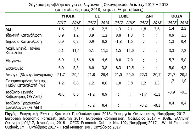 - Το 2017 ολοκληρώθηκε θετικά όσον αφορά τη δημοσιονομική ισορροπία αλλά με χαμηλότερο από τον επιθυμητό ρυθμό μεγέθυνσης. Η ανάκαμψη στηρίζεται σε δύο κύριους λόγους. Σε αντίθεση με το παρελθόν υπάρχει πλέον συμφωνία μεταξύ κυβέρνησης και αντιπολίτευσης για την ανάγκη να εφαρμοστούν τα προγράμματα και να αποφεύγονται διενέξεις με τους δανειστές και εταίρους. Η ισχυρή ανάπτυξη στο εξωτερικό περιβάλλον και ειδικά στην Ευρώπη, πλέον του αναμενόμενου, λειτουργεί ευεργετικά και τραβά την οικονομία προς τα πάνω.