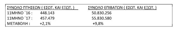 Από τα στατιστικά στοιχεία για τον Νοέμβριο του 2017 προκύπτουν τα εξής: