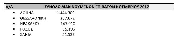 *Αύξηση 8,1% στη συνολική επιβατική κίνηση (εσωτερικού - εξωτερικού) τον Νοέμβριο του 2017 – Διακινήθηκαν 2.3 εκατ. επιβάτες