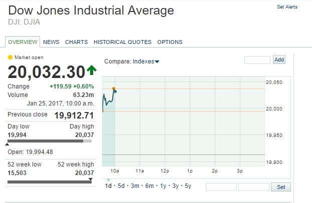 Τις 20.000 μονάδες ξεπερνά για πρώτη φορά στα χρονικά ο ιστορικός δείκτης Dow Jones ολοκληρώνοντας τελικά με επιτυχία μια προσπάθεια που είχε ξεκινήσει - στο γενικότερο ράλι της αγοράς - από την εκλογή του Ντόναλντ Τραμπ και μετά. Η Wall Street άνοιξε σήμερα με ικανοποιητικά κέρδη και τόσο ο Nasdaq όσο και ο S&P500 συνεχίζουν θετικά σε επίπεδα ρεκόρ. Το τελευταίο διάστημα η αγορά είχε "χάσει δυνάμεις" όσο παρέμενε ασαφές το πλαίσιο διακυβέρνησης του νέου προέδρου Ντόναλντ Τραμπ, ενώ επίσης αρκετοί επενδυτές έσπευσαν να ρευστοποιήσουν βραχυχρόνια κέρδη.