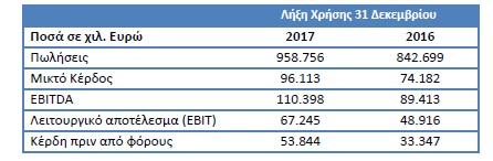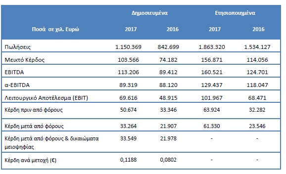 Ο ενοποιημένος κύκλος εργασιών ανήλθε σε 1.863 εκατ. ευρώ έναντι 1.534 εκατ. ευρώ το 2016. Τα ενοποιημένα κέρδη προ φόρων, τόκων και αποσβέσεων (EBITDA) σε ετήσια βάση ανήλθαν σε 160,5 εκατ. ευρώ έναντι 124,7 εκατ. ευρώ την προηγούμενη χρονιά, ενώ τα αποτελέσματα μετά από φόρους και δικαιώματα μειοψηφίας ανήλθαν σε κέρδη 61,3 εκ. ευρώ έναντι κερδών 23,5 εκ. ευρώ το 2016.