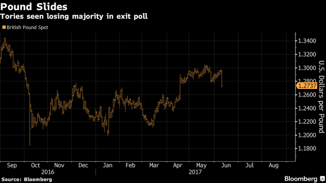 Μεγάλη βουτιά πραγματοποιεί αυτή την ώρα η στερλίνα μετά την δημοσιοποίηση του exit poll στην Βρετανία. Η ισοτιμία με το δολάριο κινείται αυτή τη στιγμή στο 1,273 με απώλειες 1,71%. Πέντε λεπτά πριν το exit poll, η στερλίνα κατέγραφε οριακές μεταβολές, υποχωρώντας μόλις κατά 0,05% έναντι του δολαρίου Οι αγορές βλέπουν με ιδιαίτερο σκεπτικισμό εαν επιβεβαιωθούν τα αποτελέσματα και δεν υπάρξει αυτοδυναμία στην Βουλή.