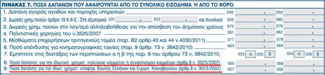 Ειδικότερα, με βάση τις οδηγίες για τη συμπλήρωση του εντύπου Ε1 του 2018, στους κωδικούς 055-056 και 057-058 του Πίνακα 7, αναγράφονται τα ποσά δαπάνης για την ιδιωτική χρηματοδότηση πολιτικού κόμματος ή συνασπισμού κομμάτων, καθώς και για την ιδιωτική χρηματοδότηση υποψηφίων ή αιρετών αντιπροσώπων της Βουλής των Ελλήνων και του Ευρωπαϊκού Κοινοβουλίου, αντίστοιχα (άρθρο 8 ν.3023/2002, όπως ισχύει).