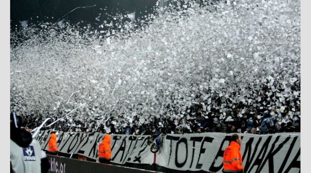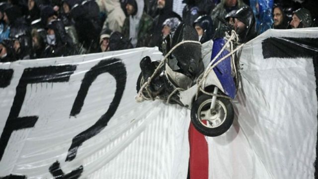 Όπως φαίνεται στις φωτογραφίες, οι οπαδοί του ΠΑΟΚ κατάφεραν και πέρασαν από τον έλεγχο(;) ένα ολόκληρο σκούτερ, το οποίο μάλιστα το κρέμασαν στα κάγκελα που χωρίζουν την κερκίδα από τον αγωνιστικό χώρο.