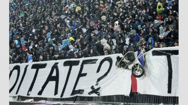 Δεν ξεκίνησε το ντέρμπι της Τούμπας, αφού λίγο πριν την έναρξη ο προπονητής του Ολυμπιακού Οσκαρ Γκαρθία, δέχτηκε στο κεφάλι ρολό χαρτιού και αυτό ήταν αιτία να αποχωρήσει ο Ολυμπιακός στα αποδυτήρια, ενώ στα κάγκελα του γηπέδου, οι οπαδοί του ΠΑΟΚ κρέμασαν ένα ολόκληρο σκούτερ!