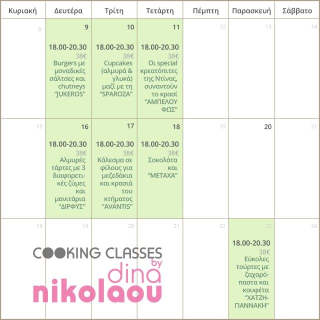 Οι φίλοι των ελληνικών γεύσεων έχουν τη δυνατότητα στα πλαίσια των μαθημάτων, να έρθουν σε επαφή με μοναδικά προϊόντα μικρών παραγωγών, εκλεκτούς συνοδευτικούς οίνους αλλά και πρωτότυπες και δημιουργικές συνταγές, πάντα υπό την καθοδήγηση και τις συμβουλές της σεφ. Έλληνες και Γάλλοι σεφ, γευσιγνώστες, δημοσιογράφοι και επαγγελματίες του χώρου της εστίασης, θα είναι μερικοί από τους προσκεκλημένους οι οποίοι θα κληθούν να μοιραστούν τις γνώσεις και εμπειρίες τους με τους συμμετέχοντες.