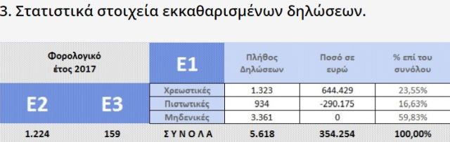 Από αυτές εκκαθαρίστηκαν ήδη 5.618 δηλώσεις εκ των οποίων, οι 3.361 ή το 59,8% είναι μηδενικές, οι 934 (16,6%) είναι πιστωτικές ,ε επιστροφή φόρου συνολικού ύψους 290.175 ευρώ και 1.323 (23,6%) είναι άτυχοι, καθώς θα λάβουν χρεωστικά εκκαθαριστικά με συνολικό ποσό για καταβολή ύψους 644.429 ευρώ. Το μέσο ποσό φόρου, ανά χρεωστικό εκκαθαριστικό είναι 487,1 ευρώ, ενώ το μέσο ποσό επιστροφής είναι 151,3 ευρώ.