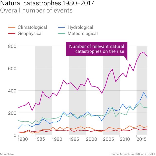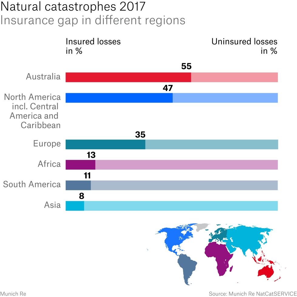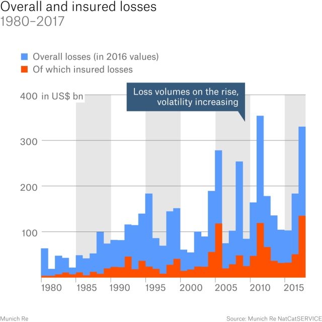 Τα μακροπρόθεσμα καιρικά συμβάντα από το 1980 υπολογίζονται στο 41% των συνολικών απαιτήσεων έναντι φυσικών καταστροφών. Σε αντίθεση, οι πλημμύρες και κλιματικά συμβάντα το καθένα υπολογίζεται στο 8% και τα γεωφυσικά συμβάντα στο 3% των ζημιών.