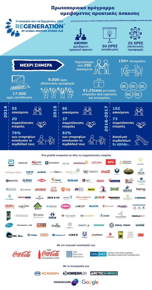 Μία εποχή ανανέωσης ξεκινά για το ReGeneration, το πρωτοποριακό πρόγραμμα αμειβόμενης απασχόλησης, που έχει ως στόχο να γεφυρώσει το κενό μεταξύ νέων ταλαντούχων πτυχιούχων και των εταιρειών, οι οποίες δυσκολεύονται να βρουν στους σημερινούς αποφοίτους τις δεξιότητες που θεωρούν απαραίτητες. Με νέα ομάδα, νέα στρατηγική και ανανεωμένο λογότυπο, η πρωτοβουλία της κοινότητας Global Shapers Athens Hub αποδεικνύει για ακόμη μία φορά πως βρίσκεται κοντά στους νέους ανθρώπους.