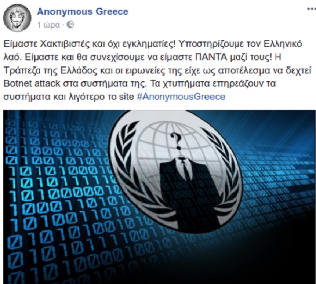 Σε ανάρτησή τους στο Facebook ανέφεραν: «Είμαστε Χακτιβιστές και όχι εγκληματίες! Υποστηρίζουμε τον Ελληνικό λαό. Είμαστε και θα συνεχίσουμε να είμαστε ΠΑΝΤΑ μαζί τους! Η Τράπεζα της Ελλάδος και οι ειρωνείες της είχε ως αποτέλεσμα να δεχτεί Botnet attack στα συστήματα της. Τα χτυπήματα επηρεάζουν τα συστήματα και λιγότερο το site. #AnonymousGreece».