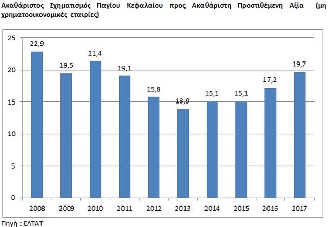 Πρώτη και πιο σημαντική τάση συνιστά η τόνωση των παραγωγικών επενδύσεων, δηλαδή του ακαθάριστου σχηματισμού παγίου κεφαλαίου, οι οποίες έκλεισαν το δ’ τρίμηνο 2017 με ετήσια άνοδο 28,9%. Αυτό είχε ως συνέπεια να μεταβληθεί η εικόνα για το σύνολο του έτους και στις μη χρηματοοικονομικές επιχειρήσεις ο λόγος επενδύσεων προς ακαθάριστη προστιθέμενη αξία να αυξηθεί το 2017 κατά 2,5 ποσοστιαίες μονάδες και σχεδόν 6 π.μ. έναντι του 2013. Εξέλιξη που οφείλεται αποκλειστικά στις ιδιωτικές επενδύσεις, δεδομένου ότι οι δημόσιες έμειναν στάσιμες εξαιτίας των δημοσιονομικών περιορισμών όλης της περιόδου.