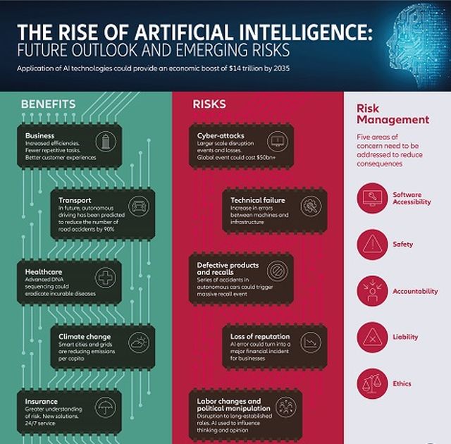 H τεχνητή νοημοσύνη μπαίνει στην αγορά και γίνεται απαραίτητο στοιχείο πολλών κλάδων όπως στην οικονομία, στην πολιτική, στις μεταφορές, στην υγεία, ασφάλεια και το περιβάλλον διαταράσσοντας τους παραδοσιακούς ρόλους στην αγορά εργασίας. Εγείρονται νέοι κίνδυνοι και οφέλη ενώ ο βαθμός εξάρτησης από την τεχνολογία αυτή έγκειται στο βαθμό που ο κάθε τομέας θα υιοθετήσει την τεχνολογία σύμφωνα με την Allianz Global & Corporate Specialty. Για την ώρα όπως όλα δείχνουν οι κίνδυνοι έχουν υποτιμηθεί, ενώ οι ευκαιρίες έχουν υπερτιμηθεί.