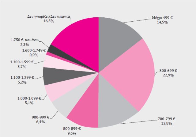 • κάτω των 800 ευρώ είναι το 10,4% (3,1% έως 499 ευρώ, 3,3% μεταξύ 500 - 699 ευρώ και 3,9% μεταξύ 700-799 ευρώ),