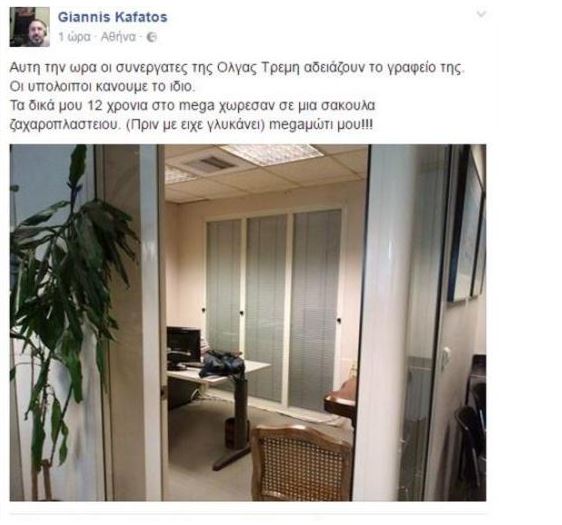 «Αυτή την ώρα οι συνεργάτες της Όλγας Τρέμη αδειάζουν το γραφείο της. Οι υπόλοιποι κάνουμε το ίδιο. Τα δικά μου 12 χρόνια στο mega χώρεσαν σε μια σακούλα ζαχαροπλαστείου. (Πριν με είχε γλυκάνει) megaμώτι μου!!!»