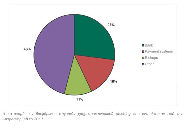 Το 2017, οι anti-phishing τεχνολογίες της Kaspersky Lab ανίχνευσαν πάνω από 246 εκατομμύρια απόπειρες χρηστών να επισκεφτούν διαφορετικά είδη ιστοσελίδων phishing. Από αυτές, πάνω από το 53% ήταν απόπειρες επίσκεψης ενός ιστότοπου χρηματοοικονομικού περιεχομένου – μέγεθος υψηλότερο κατά 6 ποσοστιαίες μονάδες σε σύγκριση με τα στοιχεία του 2016. Αυτή είναι η πρώτη φορά από την καταγραφή προσπαθειών phishing που τα μεγέθη αυτά έχουν ξεπεράσει το 50%, σύμφωνα με την ανάλυση του τοπίου χρηματοοικονομικών απειλών που πραγματοποίησε η Kaspersky Lab.