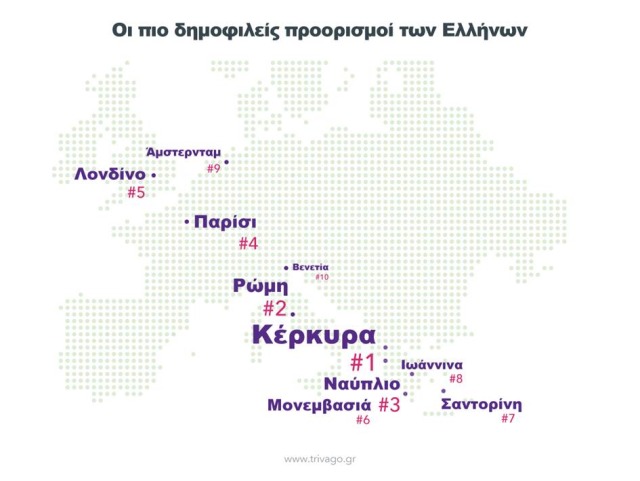 Υποσκελίστηκε μετά από τρία χρόνια από την πρώτη θέση των προτιμήσεων των Ελλήνων ταξιδιωτών η Ρώμη, παραχωρώντας την θέση της στην Κέρκυρα. Αυτό αντανακλά την γενικότερη τάση επιστροφής των Ελλήνων σε εγχώριους προορισμούς. Χαρακτηριστικά, ενώ πέρσι οι οκτώ από τους δέκα προορισμούς ήταν διεθνείς, φέτος ο αριθμός αυτός μειώθηκε στους πέντε. Πιο συγκεκριμένα, πέρσι στην πρώτη δεκάδα ήταν μόνο η Κέρκυρα και το Ναύπλιο, ενώ φέτος στη λίστα προστέθηκε η Μονεμβασιά, καταλαμβάνοντας την έκτη θέση, ακολουθούμενη από τη Σαντορίνη και τα Ιωάννινα στην έβδομη και όγδοη θέση, αντίστοιχα. Από τους διεθνείς προορισμούς το Παρίσι κατέλαβε την τέταρτη θέση με το Λονδίνο να είναι στην πέμπτη, ενώ το Άμστερνταμ και η Βενετία συμπληρώνουν τη λίστα βρισκόμενες στην ένατη και δέκατη θέση αντίστοιχα.