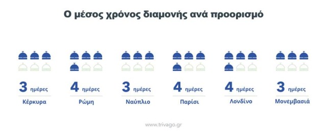 Ο μέσος χρόνος διαμονής στην Κέρκυρα, το Ναύπλιο, τη Μονεμβασιά, τη Σαντορίνη και τα Ιωάννινα είναι 3 ημέρες, ενώ στη Ρώμη, το Παρίσι, το Λονδίνο και το Άμστερνταμ είναι 4 ημέρες, ενώ στην Βενετία είναι 3 ημέρες.