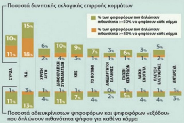 Συγκεκριμένα, σε επίπεδο δυνητικής εκλογικής επιρροής ο ΣΥΡΙΖΑ κινείται έως το 21% (18% τον Νοέμβριο), η Ν.Δ. έως το 33% (29%), η Χρυσή Αυγή έως το 8% (10%), η Δημοκρατική Συμπαράταξη έως το 14% (10%), το ΚΚΕ 12% (14%), το ΠΟΤΑΜΙ 8% (8%), οι ΑΝ.ΕΛΛ. 4% (5%), η Ενωση Κεντρώων έως το 7% (8%), η Λαϊκή Ενότητα έως το 4% (3%) και η Πλεύση Ελευθερίας έως το 7% (7%).