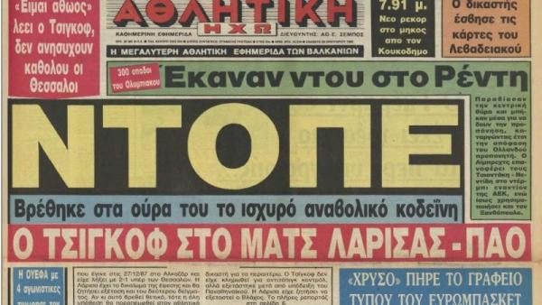 Η Λάρισα, πήρε το ένα και μοναδικό της πρωτάθλημα το 1988. Είχε μια εκπληκτική φουρνιά παικτών από τον θεσσαλικό κάμπο, έπαιξε φανταστικό ποδόσφαιρο (στιγμιότυπα μπορεί να αναζητήσει κανείς στο YouTube). Ωστόσο εκείνο το πρωτάθλημα κρίθηκε στα χαρτιά, καθώς εντοπίστηκε ντοπαρισμένος ένας παίκτης της ΑΕΛ, ο Βούλγαρος Τσίγκωφ. Ο κανονισμός τότε προέβλεπε την αφαίρεση βαθμών από την ομάδα στην οποία εντοπιζόταν παίκτης ντοπέ. Ας θυμηθούμε την ιστορία.