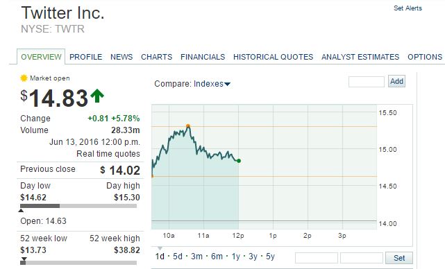 Σημαντική άνοδο καταγράφει και ο τίτλος του γνωστού μέσου κοινωνικής δικτύωσης, Twitter καθώς συμπαρασύρεται θετικά λόγω του deal που απασχολεί την παγκόσμια κοινότητα και τον τεχνολογικό κλάδο, δηλαδή της Microsoft με το LinkedIn.