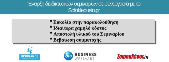 Η Insurance Innovation και το sofokleousin.gr προχωρούν σε μία καινοτόμα συνεργασία με σκοπό την διοργάνωση και διεξαγωγή εξειδικευμένων οικονομικών διαδικτυακών σεμιναρίων με θεματολογία που σχετίζεται με το marketing, την οικονομία, θέματα ψυχολογίας κλπ.