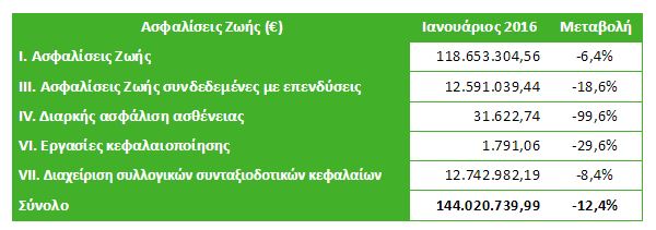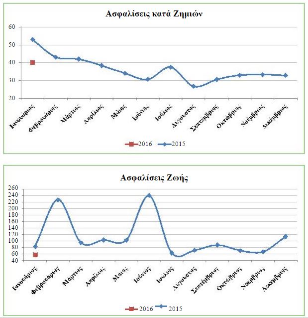 Τον Ιανουάριο του 2016, οι ασφαλίσεις Ζωής συνέχισαν την καθοδική τους τάση, η οποία ξεκίνησε τον Ιούλιο του 2015. Επίσης, οι ασφαλίσεις κατά Ζημιών συνεχίζουν να κινούνται πτωτικά.