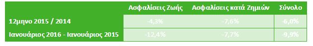Πτώση 10% σημείωσε η ασφαλιστική αγορά στο σύνολο της στο διάστημα Ιανουαρίου 2015 - Ιανουαρίου 2016. Την μεγαλύτερη πτώση κατέγραψαν οι ασφαλίσεις ζωής (-12,4%) λόγω κυρίως των προϊόντων ζωής συνδεδεμένων με επενδύσεις (unit linked) από την επιβολή των ελέγχων κίνησης κεφαλαίων. Oι ασφαλίσεις κατά ζημιών έγραψαν -7,7%.
